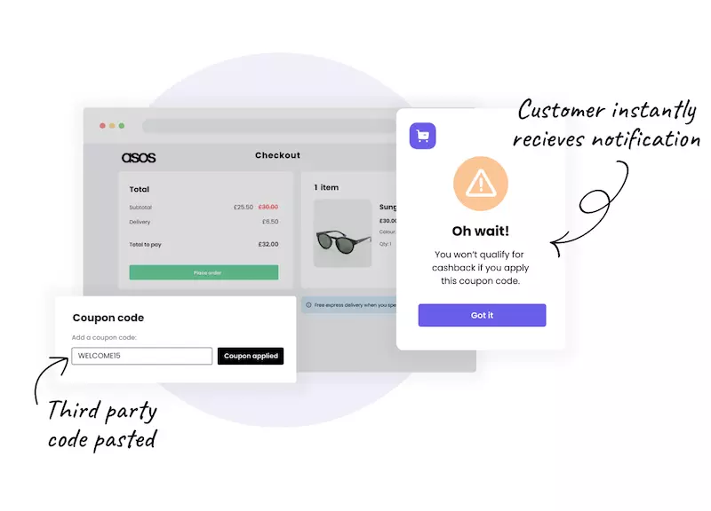 Warns shoppers about potential miss on activation if they apply third-party coupons within your affiliate session.